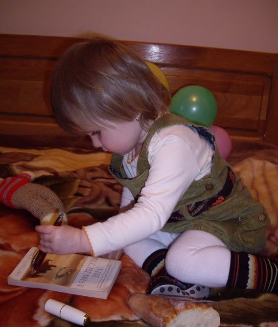 A ales aur, cheile de la masina(au un breloc atragator) si pixul. Cu fiecare din cele trei obiecte alese s-a jucat citeva minute si dupa aceea chiar daca avea imprastiate linga ea piinea, cartea, parfum, ruj, bani.